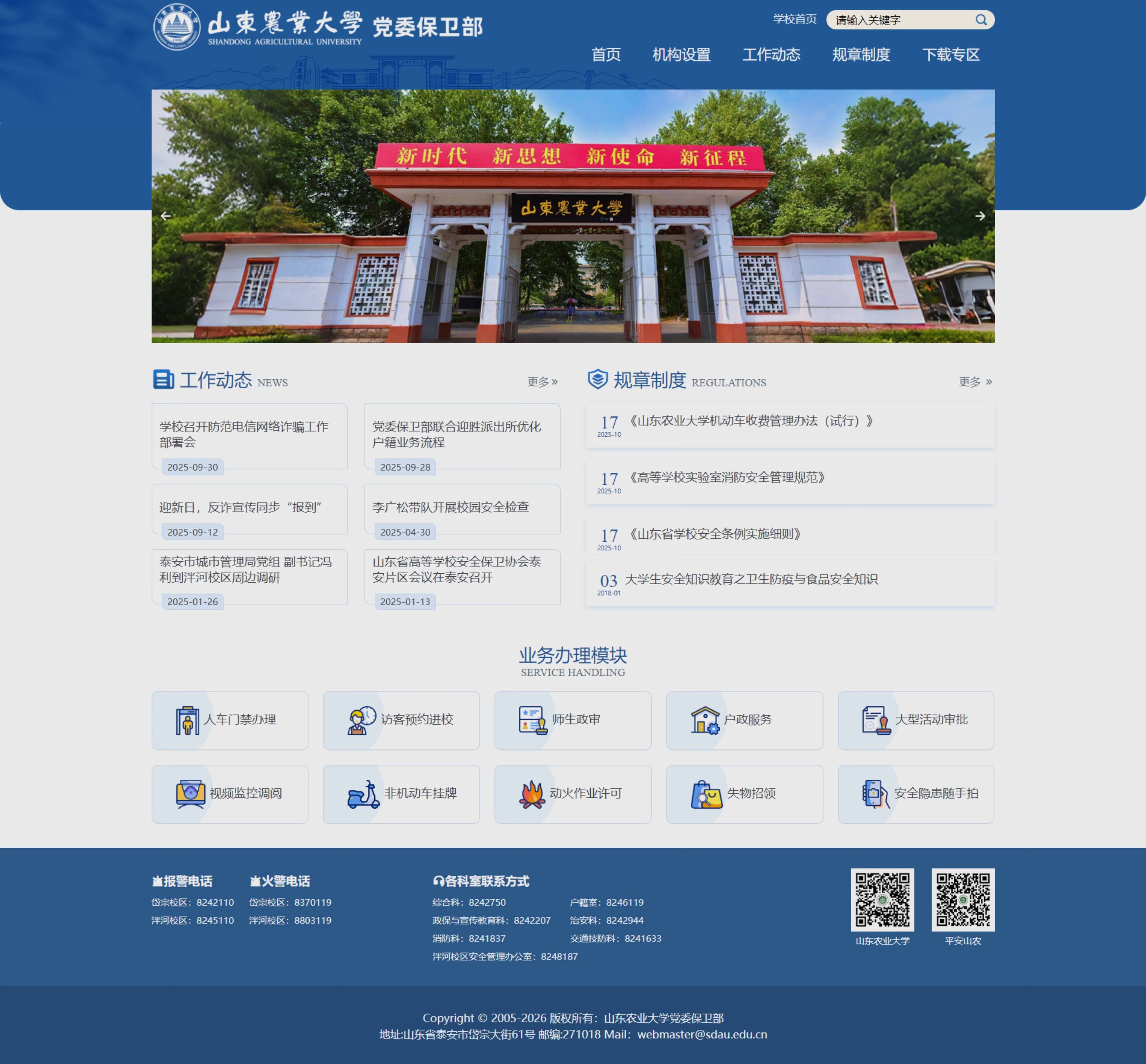近日,党委保卫部官方网页(https://gac.sdau.edu.cn/)完成全新改版并正式上线运行。此次改版以“聚焦师生需求、优化服务体验”为核心目标,通过重构页面架构、整合服务资源、升级功能模块,着力将网页打造为便捷高效的“一站式”线上服务平台,切实提升校园安全管理服务效能。